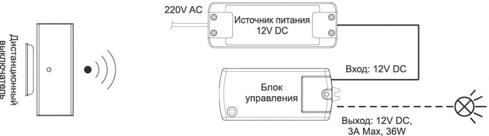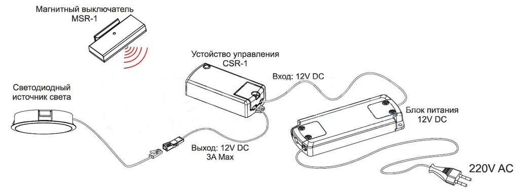 Беспроводный выключатель с магнитным датчиком, срабатывает на размыкание магнита. Дистанционный выключатель устанавливается на раму выдвижного ящика или раму шкафа. Магнит устанавливается на выдвижном ящике или дверце шкафа. К одному блоку управления можно подключить до 4-х выключателей. При размыкании - включается источник света, при смыкании выключается.