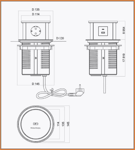 Количество розеток в блоке 3 SCHUKO + беспроводная зарядка + USB A + USB C
